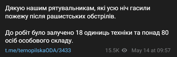 Напомним, в ночь с 13 на 14 мая по Украине наносился очередной ракетный удар. Прилет крылатых ракет был в Тернополе: есть разрушение двух и повреждение двенадцати дачных домов.
