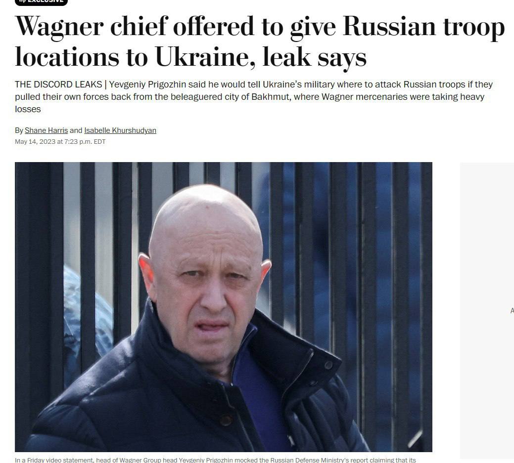 The Washington Post со ссылкой на утечки секретных документов из Пентагона пишет, что куратор ЧВК "Вагнер" Пригожин имел контакты с украинской разведкой и предлагал сделку: слить данные о местонахождении армейских частей РФ для нанесения ударов, взамен на уход ВСУ из Бахмута.