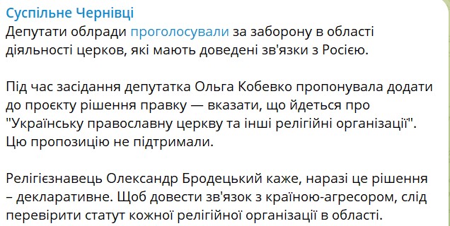 Черновицкий облсовет проголосовал за запрет деятельности на территории области религиозных организаций, в отношении которых "доказана каноническая связь с Россией".