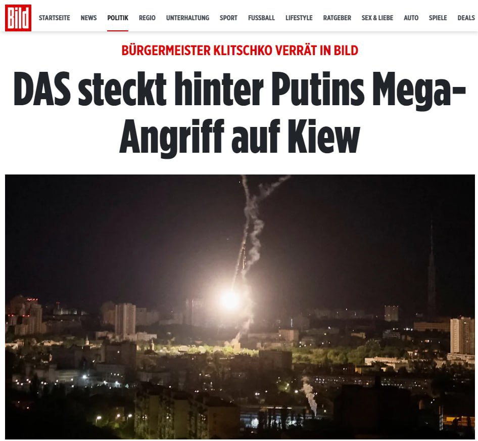 Слова мэра прокомментировал бывший чиновник Бундесвера Нико Ланге: "Россия испытывает в Киеве новые системы ПВО Украины. Ракетами "Кинжал", "Калибр", Х101, Х555 и беспилотниками "Шахид" и "Орлан" атакующая армия хочет сделать выводы о позициях украинских систем ПВО, таких как Patriot, Iris и NASAMS".