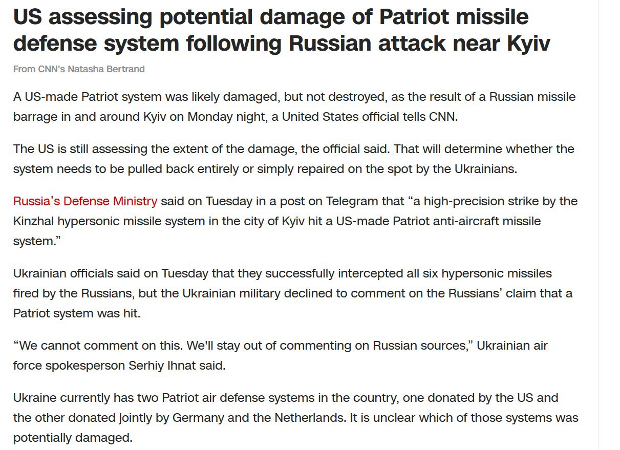 Американская система Patriot, по которой целились россияне минувшей ночью, вероятно, была повреждена, но не уничтожена в результате обстрела российскими ракетами Киева.