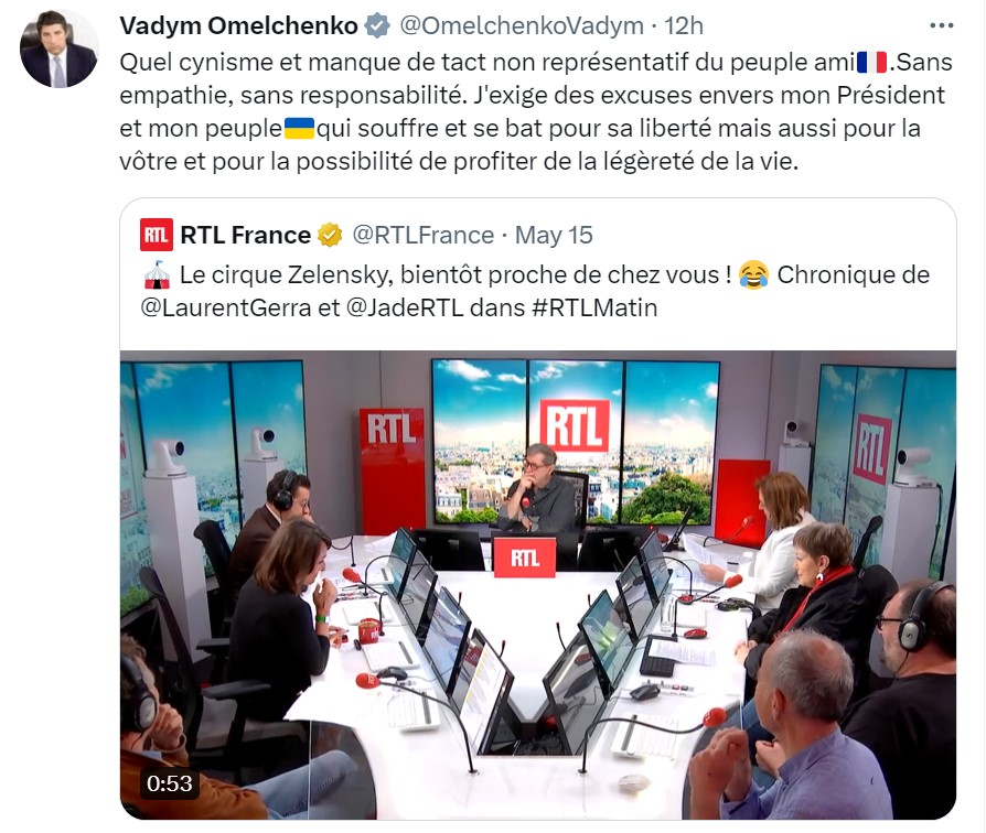 "Какой цинизм и бестактность, не присущие дружественному французскому народу. Без эмпатии, без ответственности. Требую извинений перед моим президентом и народом Украины, страдающим и борющимся за свою свободу, но также и вашу свободу и возможность наслаждаться легкостью бытия", - написал он.