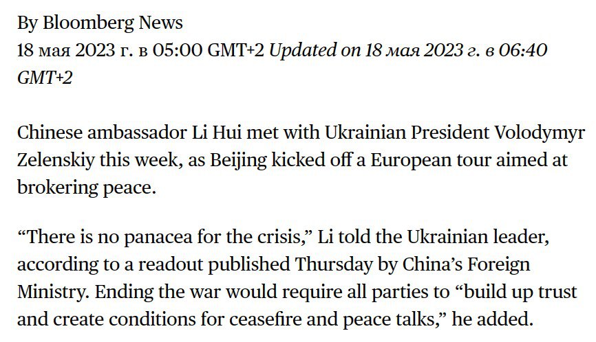 Тем временем, агентство Bloomberg пишет, что спецпредставитель Китая Ли Хуэй уже встретился с президентом Украины Владимиром Зеленским.