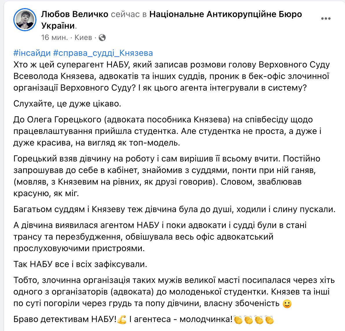 Многим судьям и Князеву тоже девушка была по душе, ходили и слюну пускали. А девушка оказалась агентом НАБУ и пока адвокаты и судьи были в состоянии транса и перевозбуждения, увешивала весь адвокатский офис прослушивающими устройствами. Так НАБУ все и всех зафиксировали", - пишет Величко.