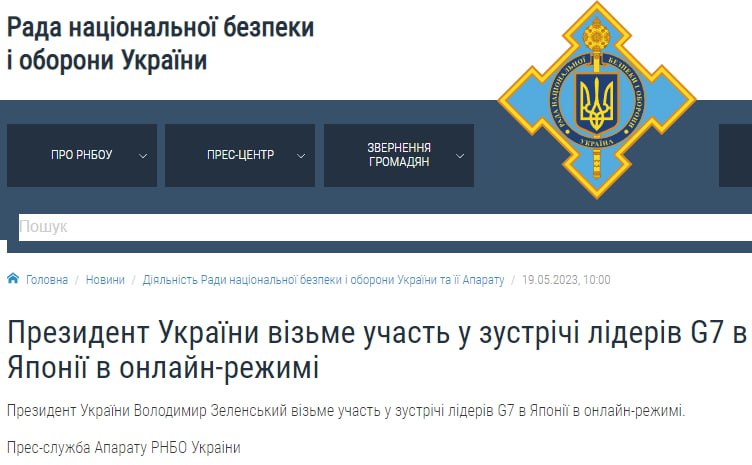 СНБО заявляет, что президент Украины все-таки не поедет в Хиросиму лично, как заявляет Bloomberg, а примет в нем участие онлайн.