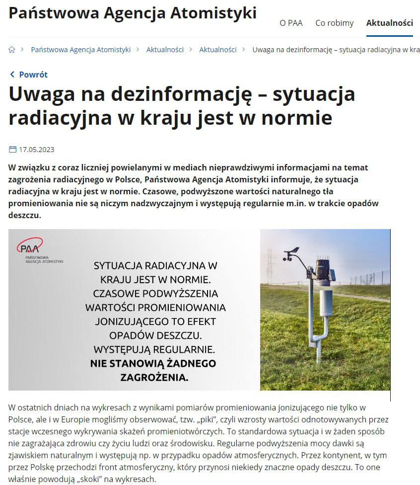 "В настоящее время на территории Польши нет угрозы здоровью и жизни людей, а также окружающей среде. Польское атомное агентство не зафиксировало никаких тревожных показаний измерительной аппаратуры", - говорится в сообщении PAA.