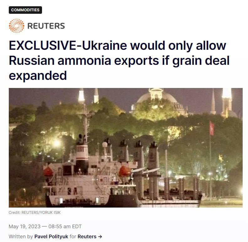 Украина хочет расширить сделку по зерну, включив в нее новые порты и больше товаров в обмен на включение в соглашение возобновления прокачки аммиака из России по аммиакопроводу Тольятти-Одесса.