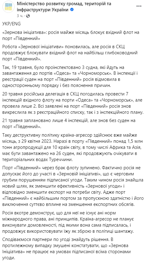 Между тем Россия продолжает блокировать входной флот на порт "Южный" в рамках "зерновой инициативы" уже почти месяц. Об этом сообщает Министерство развития общин и территорий Украины в Facebook.