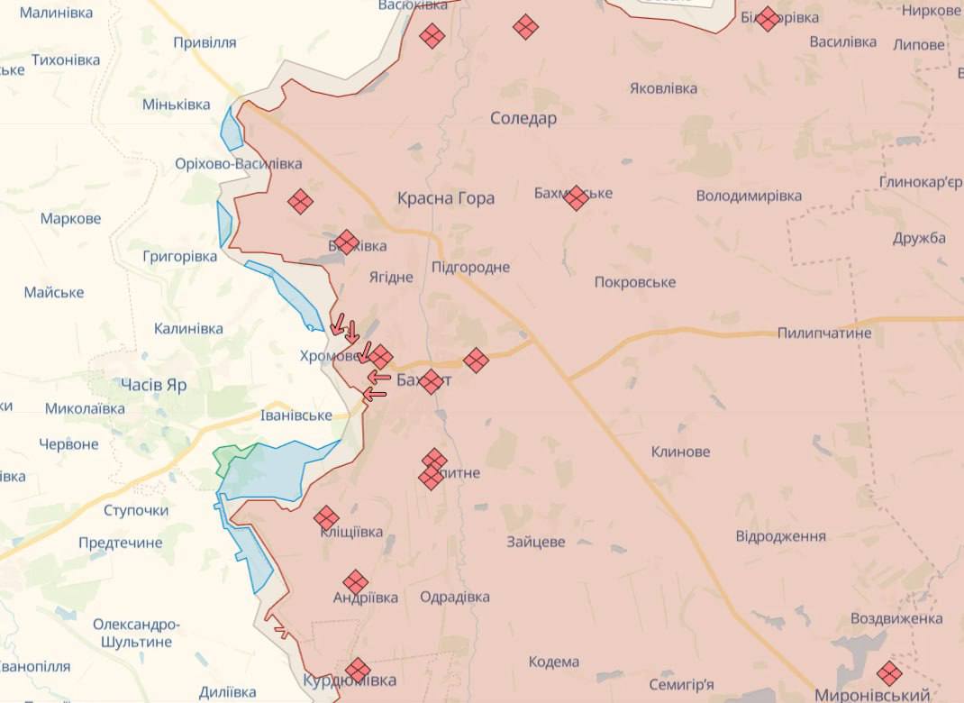 Впрочем, ни окружения Бахмута, ни его "полуокружения", о котором заявила Анна Маляр, на данный момент нет. Это видно, в частности, по карте украинского паблика Deep State.