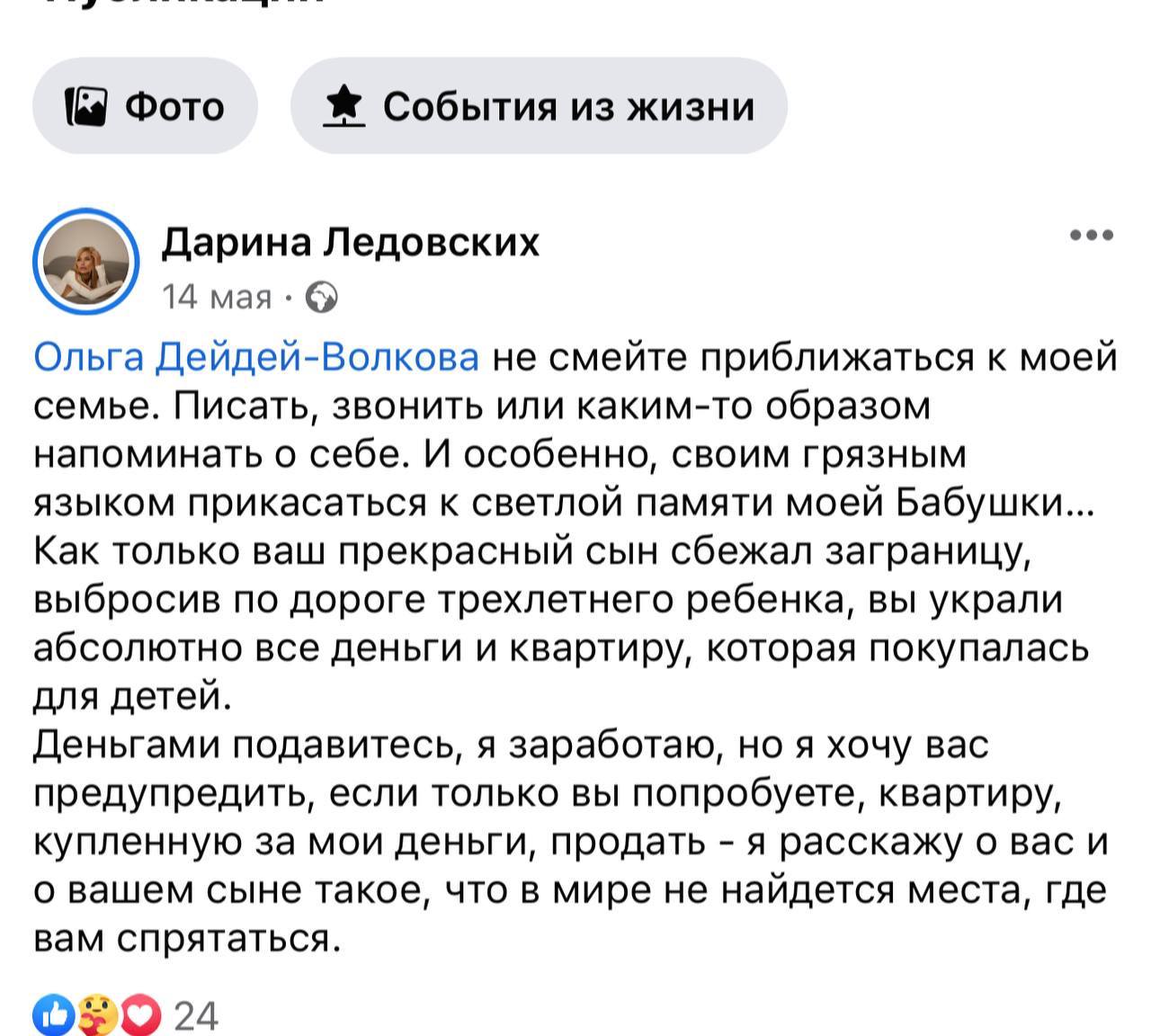"Как только ваш прекрасный сын сбежал заграницу, выбросив по дороге трехлетнего ребенка, вы украли абсолютно все деньги и квартиру, которая покупалась для детей" - написала она.
