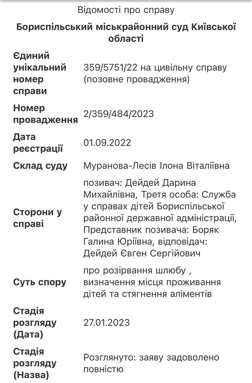 Жена объявленного погибшим экс-нардепа Евгения Дейдея Дарья Ледовских сообщила, что официально развелась с ним.
