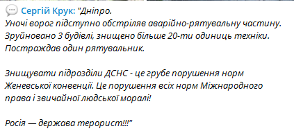 Одна из атак пришлась по аварийно-спасательной части Госслужбы по чрезвычайным ситуациям. Разрушены три здания, уничтожены более 20 единиц техники, пострадал спасатель.