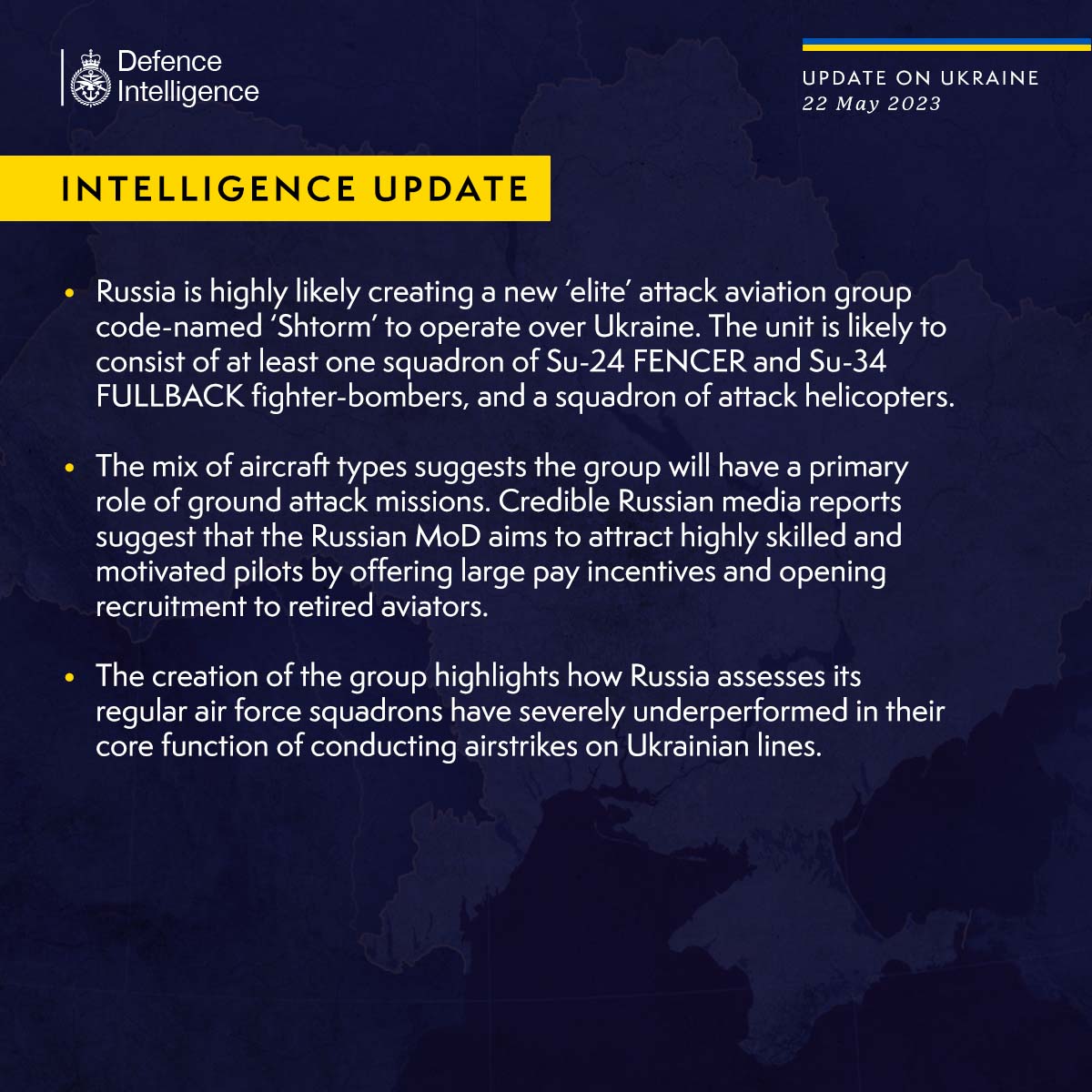 Россия создает новую авиационную группу для ударов по Украине, в состав которой, вероятно, войдет как минимум одна эскадрилья истребителей-бомбардировщиков Су-24 и Су-34, а также эскадрилья боевых вертолетов. Ее кодовое название - "Шторм".