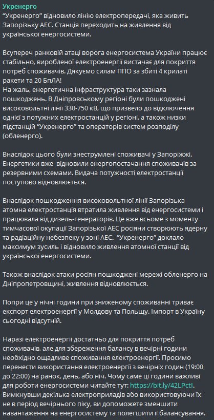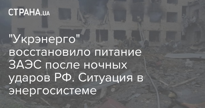 Энергетическая инфраструктура Украины получила повреждения после ночных обстрелов со стороны РФ, но уже ведутся восстановительные работы. В частности, возобновлено энергоснабжение ЗАЭС.