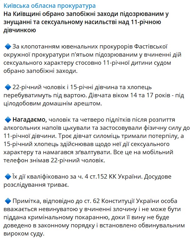 Меры пресечения избрали пятерым подозреваемым по ходатайству ювенальных прокуроров Фастовской окружной прокуратуры. 22-летний мужчина и 15-летние девушка и парень будут находиться под стражей. Девушки в возрасте 14 и 17 лет - под круглосуточным домашним арестом.