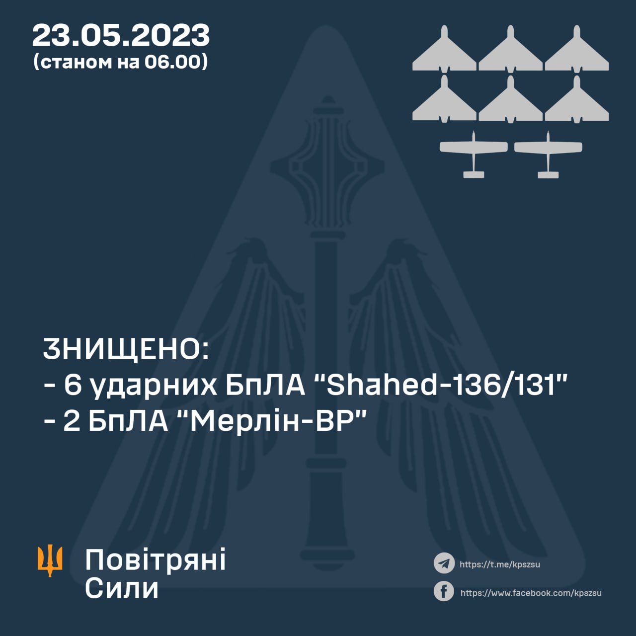 А командование Воздушных сил сообщает, что за минувшие сутки были уничтожены шесть "Шахедов" и два разведывательных дрона "Мерлин-ВР". Они атаковали на разных направлениях.
