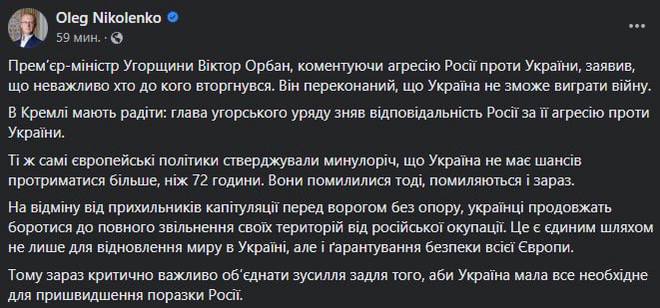 В Кремле должны радоваться: глава венгерского правительства снял ответственность России за ее агрессию против Те же европейские политики утверждали в прошлом году, что у Украины нет шансов продержаться больше, чем 72. Они ошиблись тогда, ошибаются и сейчас. оккупации.