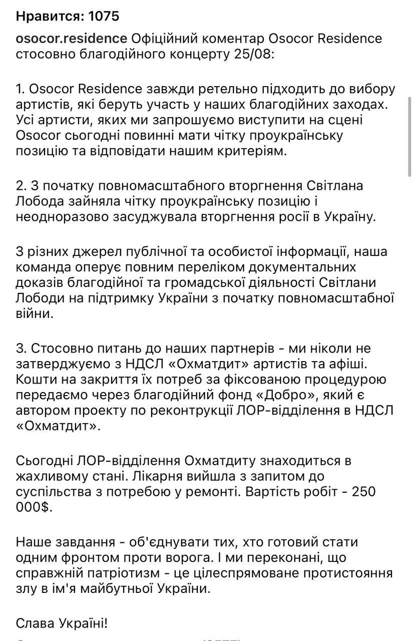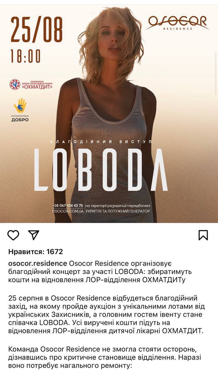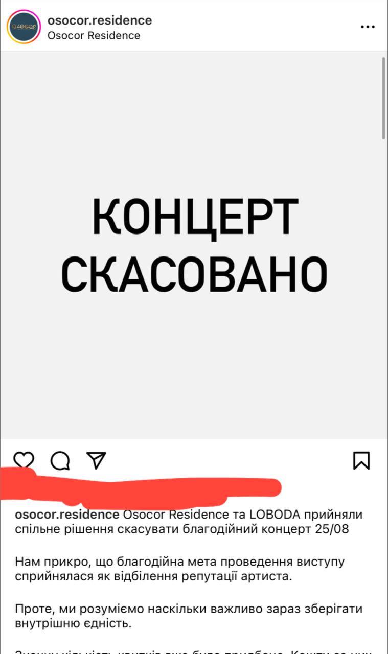 "Osocor Residence и LOBODA приняли совместное решение отменить благотворительный концерт 25/08. Нам досадно, что благотворительная цель проведения выступления воспринялась как отбеливание репутации артиста. Тем не менее, мы понимаем, насколько важно сейчас сохранять внутреннее единство. Значительное количество билетов уже было приобретено. Средства за них будут возвращены", — сообщили в "Osocor Residence".