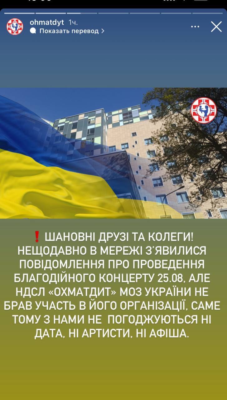 "Уважаемые друзья и коллеги! Недавно в сети появилась информация о проведении благотворительного концерта 25.08, но НДСЛ "ОХМАТДЕТ" МОЗ Украины не принимал участие в его организации, именно поэтому с нами не согласовывают ни дат, ни артистов, ни афиш", — написали в "ОХМАТДЕТ".