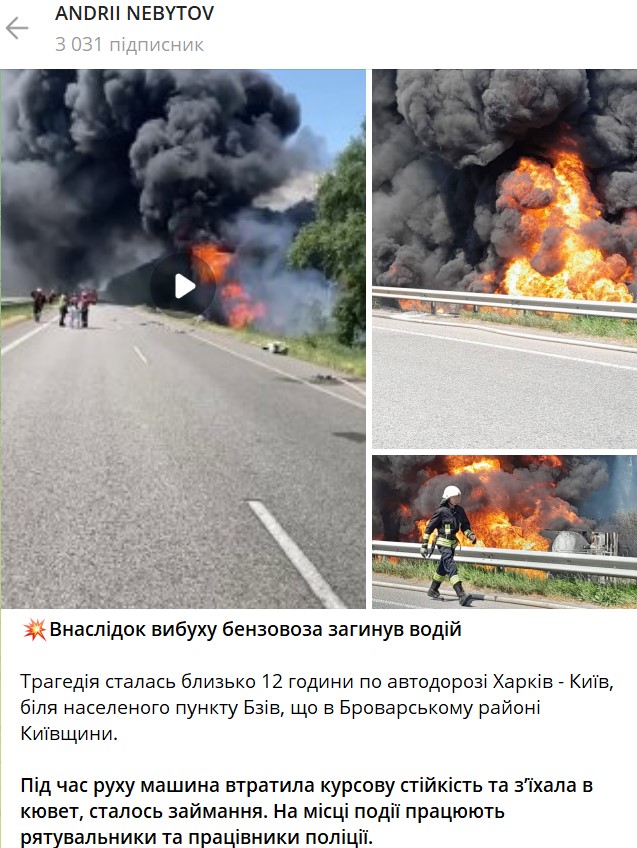 Появились подробности аварии с бензовозом в Броварском районе Киевской области. Из-за взрыва погиб водитель.