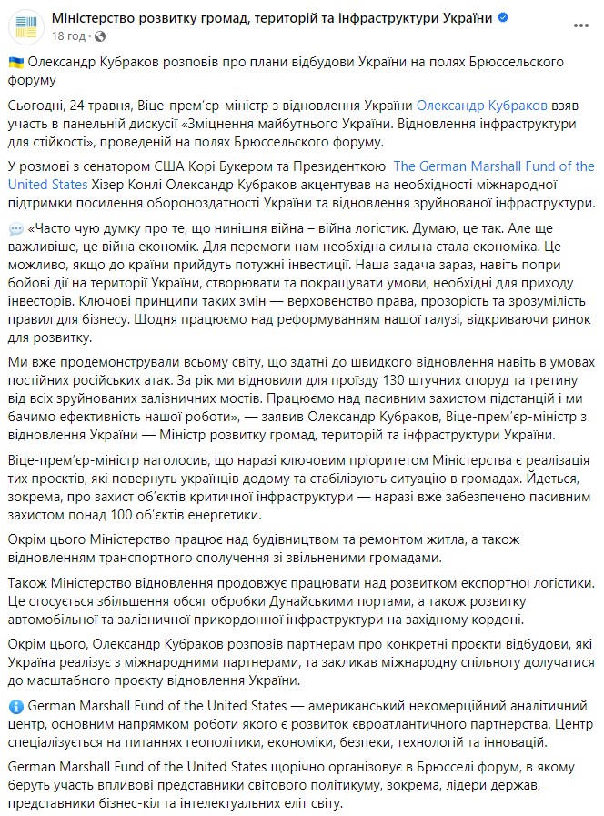 Об этом рассказал вице-премьер по восстановлению - министр развития громад, территорий и инфраструктуры Александр Кубраков.