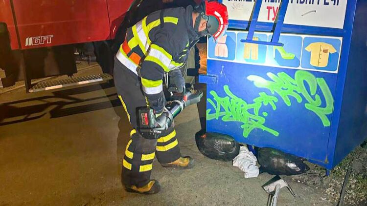 Для вскрытия контейнера с ребенком спасателям потребовалось спецоборудование. Фото: Facebook/DSNSKyiv