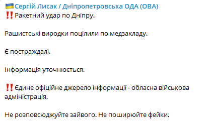 Глава Днепропетровской ОВА Сергей Лысак пишет об ударе по Днепру, который пришелся по медучреждению.
