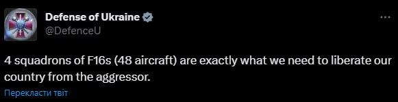 "4 эскадрильи F-16 (48 самолетов) - именно то, что нужно для освобождения нашей страны от агрессора", - сказано в сообщении.
