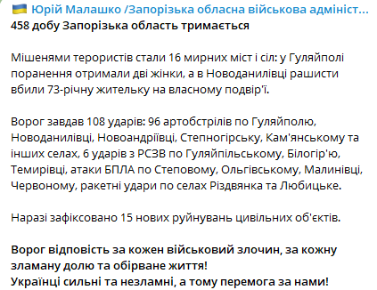 Общее количество атак составило 108, среди которых было 96 артобстрелов по городам и селам, таким как Гуляйполе, Новоданиловка, Новоандреевка, Степногорск, Каменское и другим. Дополнительно противник осуществил 6 ударов с ракетно-артиллерийских систем по Гуляйпольскому, Белогорью, Темировке, а также совершил атаки БПЛА на Степовое, Ольговское, Малиновку, Красное, нанес ракетные удары - по селам Риздвянка и Любицкое.