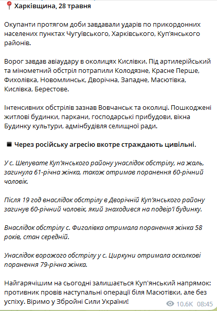 В с. Шеповатое Купянского района в результате обстрела погибла 61-летняя женщина, также получил ранение 60-летний мужчина.