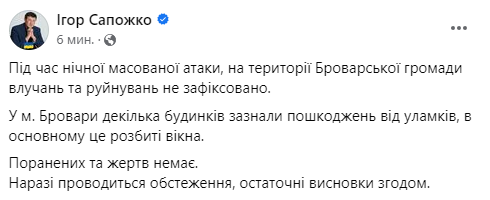 "Во время ночной массированной атаки, на территории Броварской громады попадания и разрушения не зафиксированы. В Броварах несколько домов получили повреждения от обломков, в основном это разбитые окна. Раненых и жертв нет. Проводится обследование, окончательные выводы будут позже", - написал он.