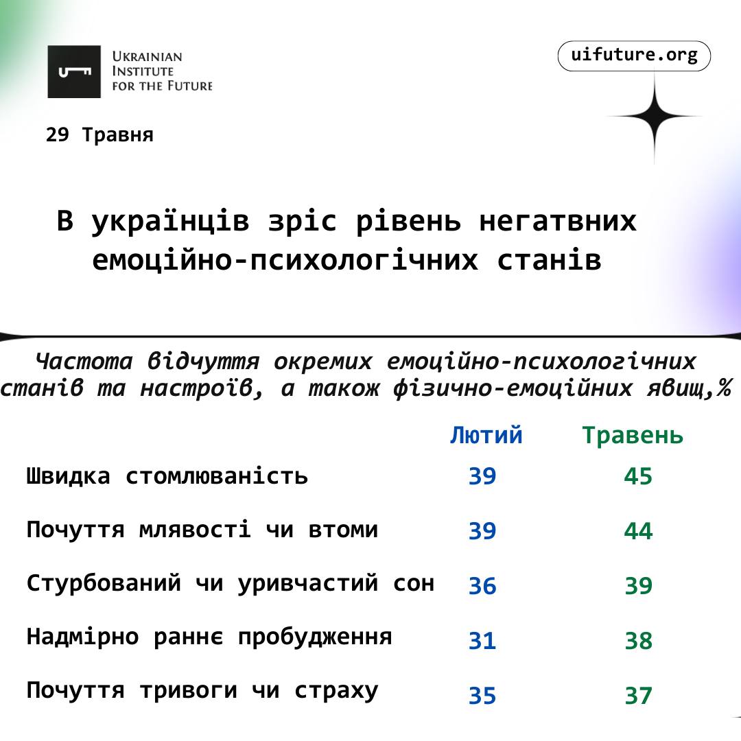Среди украинцев вырос уровень негативных эмоционально-психологических состояний за период с февраля по май. Рост частоты тревожных состояний показал опрос 1205 респондентов. Об этом сообщает "Украинский институт будущего".