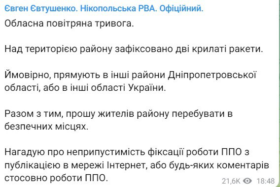 18.52 Глава Никопольского района Евгений Евтушенко сообщает о двух ракетах, летящих над Днепропетровской областью.