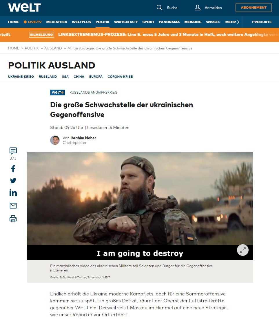 11.55 Основная слабость украинского контрнаступления - дефицит истребителей, пишет немецкий Welt.