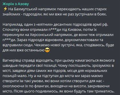 По его словам, это подразделение несло потери под Киевом и в Херсоне, теперь оно восстановлено, доукомплектовано и направлено под Бахмут.