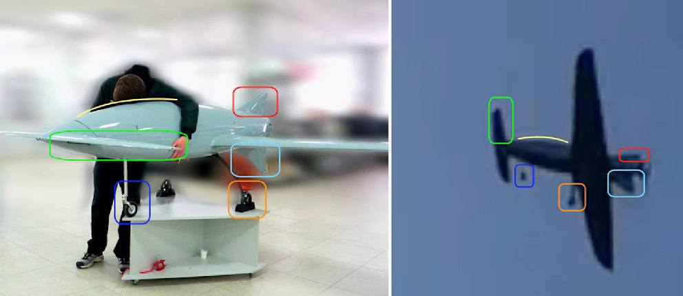 Военный эксперт Юлиан Рёпке, изучив различные фото- и видеоматериалы, отмечает сходство этого дрона с теми, что были сняты на видео в небе над Москвой (на фото справа).