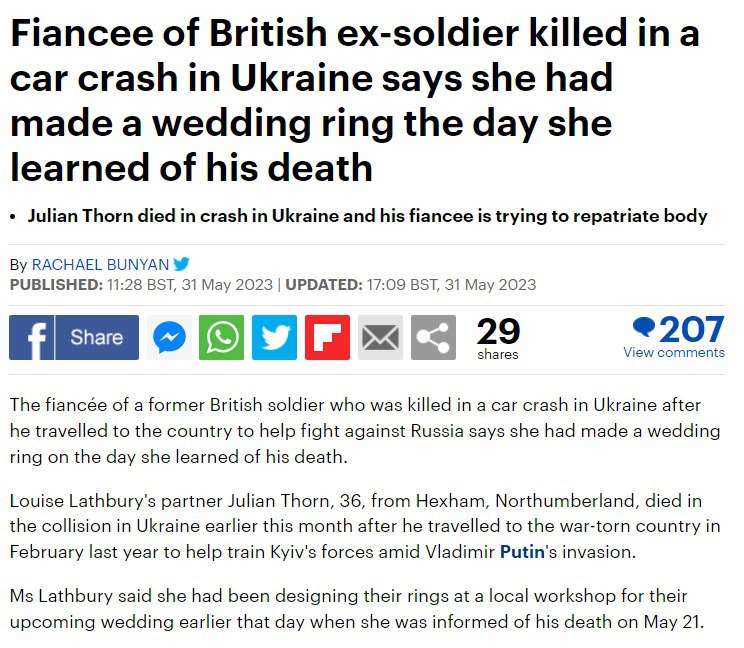 23.03 В Украине в автокатастрофе погиб снайпер из Великобритании Джулиан Торн, который приехал сюда для подготовки военнослужащих ВСУ.
