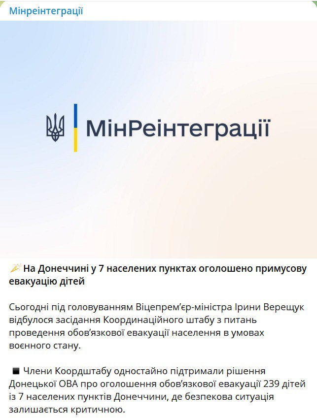 Об этом сообщил Минреинтеграции в своем тг-канале.