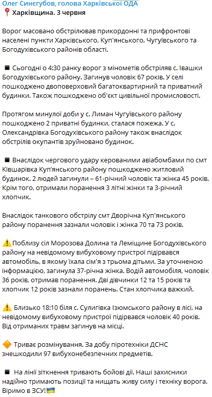 За сутки массированному обстрелу со стороны РФ подверглись населенные пункты Харьковского, Купянского, Чугуевского и Богодуховского районов Харьковской области. Противник использовал минометы и управляемые авиабомбы, нанося серьезный ущерб мирному населению и инфраструктуре.