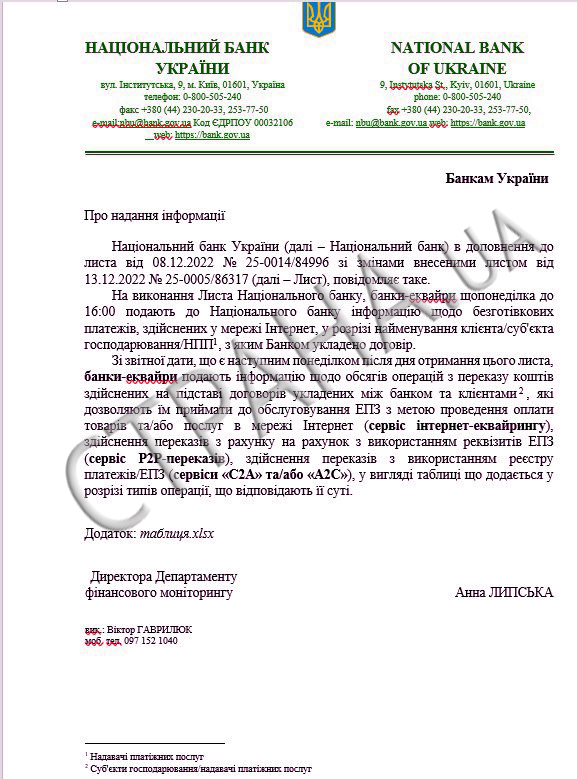 Что Нацбанк не указал в своем письме №25-0005/38228 - это с какой целью собирает все эти данные. Можно лишь предполагать, что цели связаны с финансовым мониторингом, поскольку вышеупомянутое письмо №25-0005/38228 подписано директором Департамента финансового мониторинга НБУ Анной Липской.