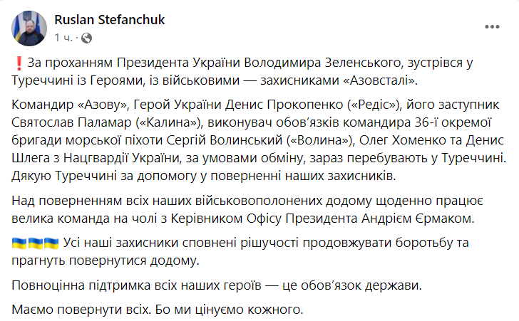 Он рассказал, что посетил командиров по просьбе президента Украины Владимира Зеленского. Стефанчук также заверил, что Украина работает над возвращением домой всех военнопленных.