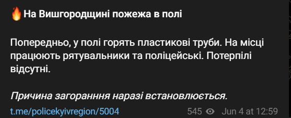 Позже стала известна причина пожара. По данным полиции Киевской области, в поле горят пластиковые трубы.