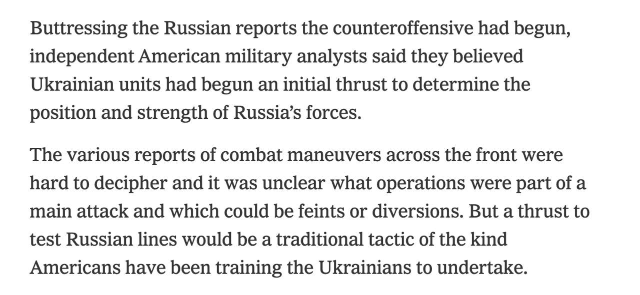 "Различные отчеты о боевых маневрах на фронте было трудно расшифровать, и было неясно, какие операции были частью главного удара, а какие могли быть уловками или диверсиями. Но попытка проверить позиции русских будет традиционной тактикой, которой американцы обучают украинцев", - пишет издание.