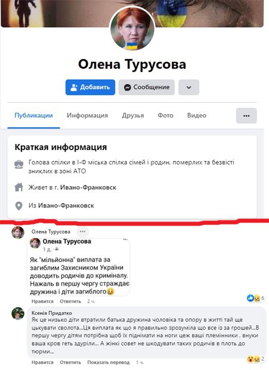 Елена Турусова, глава Ивано-Франковского союза семей умерших и без вести пропавших в зоне АТО на своей странице в Facebook предположила, что причина конфликта - "гробовые" выплаты.