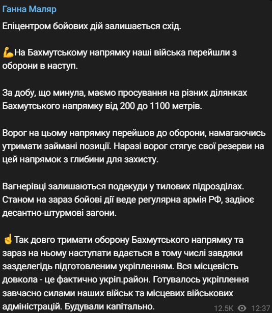 "Вагнеровцы остаются кое-где в тыловых подразделениях. По состоянию на сегодняшний день боевые действия ведет регулярная армия РФ, задействует десантно-штурмовые отряды", - пишет Маляр.