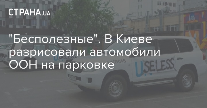 В сети появились фото, как утверждается, разрисованных автомобилей ООН на парковке в Киеве. На дверях автомобилей прикреплена скотчем надпись "Бесполезные". Она обыгрывает первую букву в названии организации - UN.