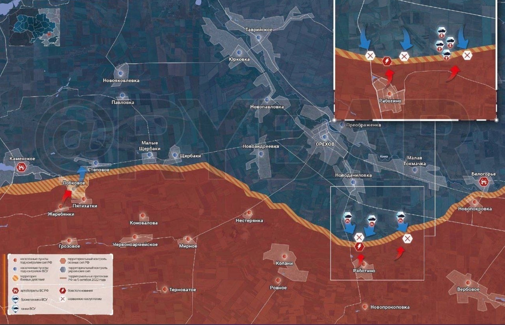 В частности, ВСУ, по данным россиян, атакуют на линии  Работино - Вербовое, концентрируясь на узких участках российской обороны, и периодически продвигаются вперед. Российские войска отходят назад, а по украинским силам начинает бить артиллерия.