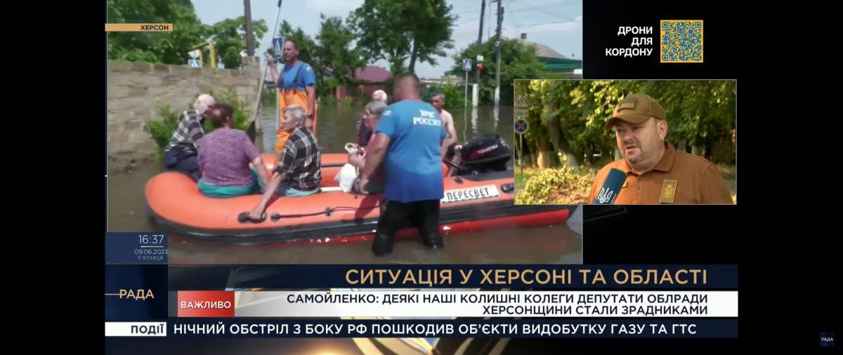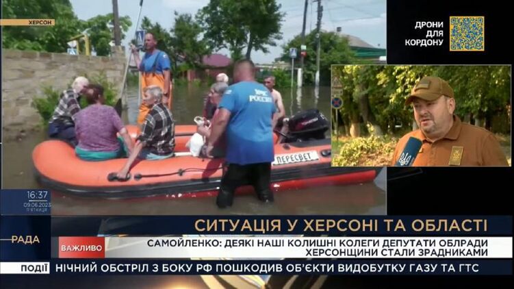 В эфире единого телемарафона в слоте телеканала "Рада" появились кадры с эвакуацией людей, проводимой МЧС России на левобережной части Херсонской области.