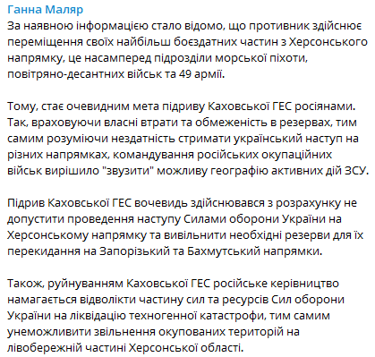 "Командование российских оккупационных войск решило "сузить" возможную географию активных действий ВСУ. Подрыв Каховской ГЭС явно осуществлялся из расчета не допустить проведения наступления Силами обороны Украины на Херсонском направлении и освободить необходимые резервы для их переброски на Запорожское и Бахмутское направления", - заявила Анна Маляр.