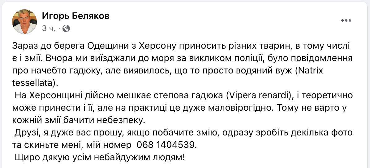 Но теоретически к Одессе может прибить и гадюку, отмечает Беляков. Директор зоопарка предлагает скидывать ему фото найденных змей.